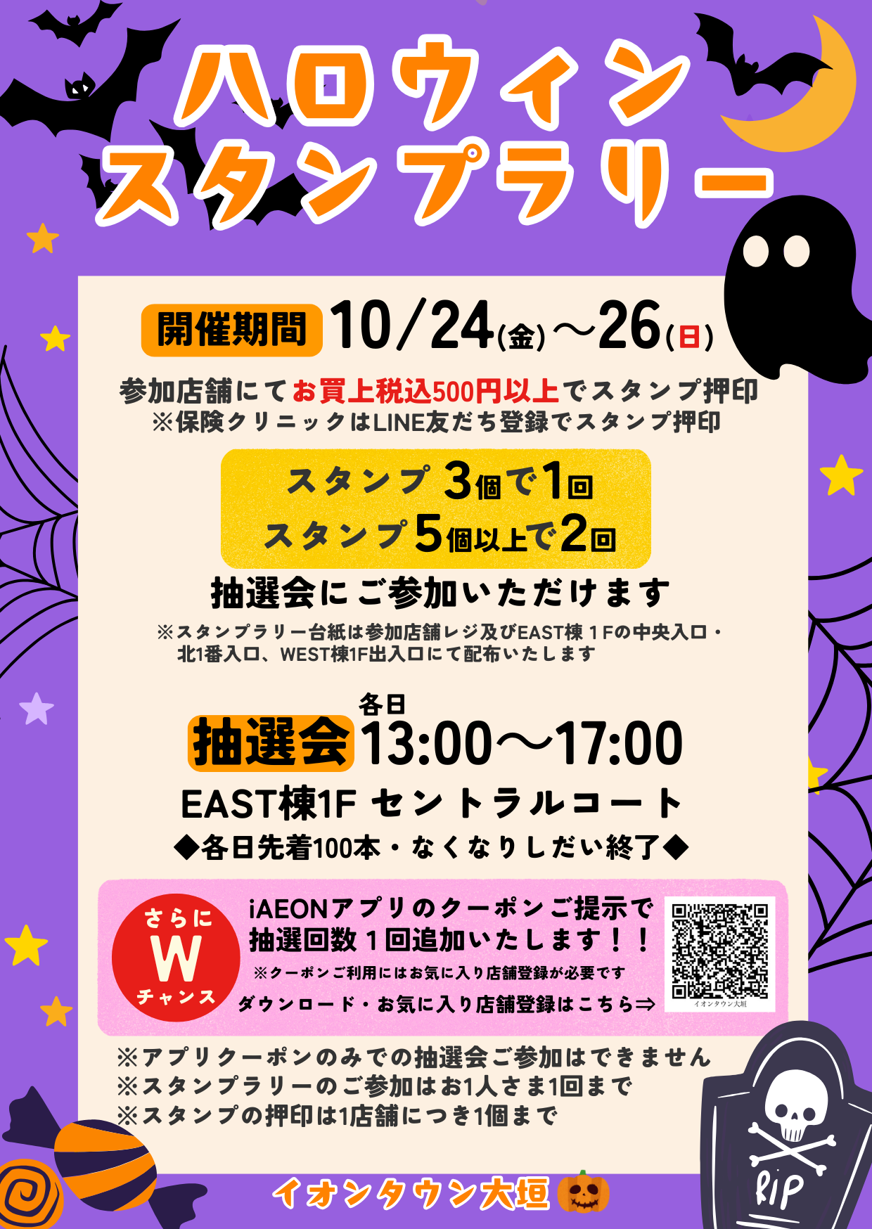 イオンタウン大垣では、10月24日(金)~26日(日)の3日間「ハロウィンスタンプラリー」を開催! EAST棟・WEST棟の参加店舗でスタンプを集めると抽選会に参加できます。台紙は各参加店舗のレジや館内入口で配布。スタンプ3個で1回、5個以上で2回抽選に挑戦でき、iAEONアプリクーポン提示でさらに1回追加(※クーポンのみでの参加は不可)。スタンプは1店舗につき1個までです。