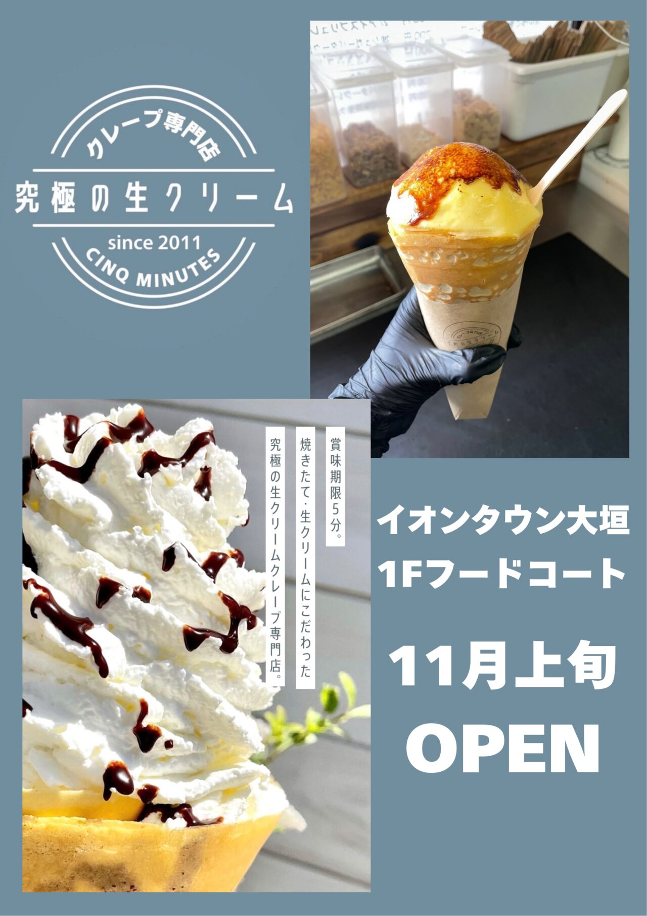 2025年11月上旬には、フードコート内に「究極の生クレープ専門店 Cinq Minutes」が新しくオープン予定。賞味期限5分にこだわり、焼きたて生地と出来たて生クリームを味わえる注目のお店です。北海道産乳100%の生クリームは、コクがありながらふんわり軽い口どけが特徴。