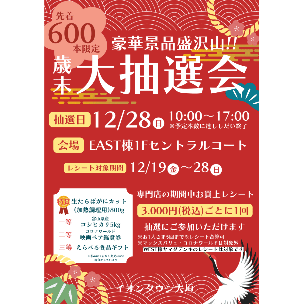 まず、ご紹介したいのは2025年12月28日(日)の「歳末大抽選会」。2025年12月19日(金)から28日(日)までの専門店のお買い上げレシートで参加することができます。抽選は3,000円(税込)ごとに1回で、お1人様5回まで。レシート合算も可能です。抽選会が行われるのは、12月28日(日)午前10時から午後5時。先着600本限定で、抽選本数に達し次第終了となりますのであらかじめご了承ください。