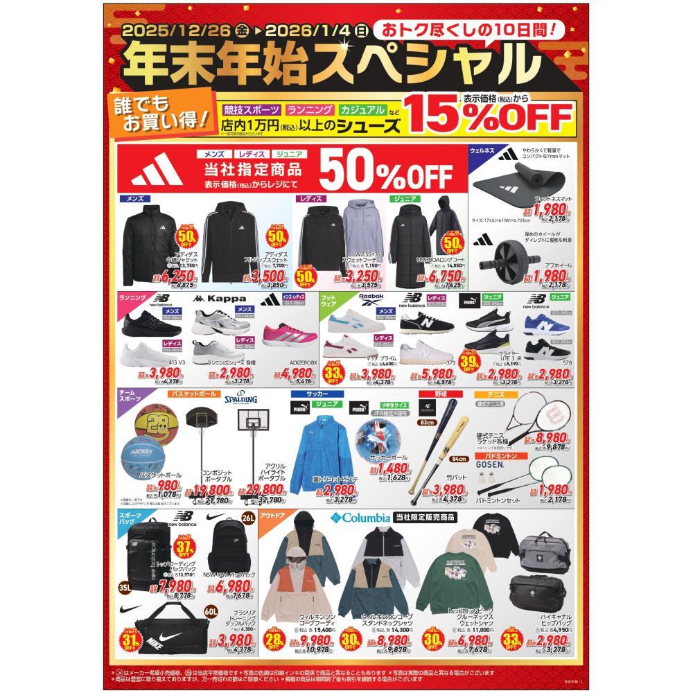 そして、年末年始は専門店街も注目です。EAST棟1階にある「MEGA SPORTS」では、2025年12月26日(金)から2026年1月4日(日)までの期間、スポーツ用品がお得に購入できるキャンペーンを開催。店内にある1万円(税込)以上のシューズは、表示価格から15%OFFとなります。新年に向けて、新しいシューズを購入するのもオススメ。