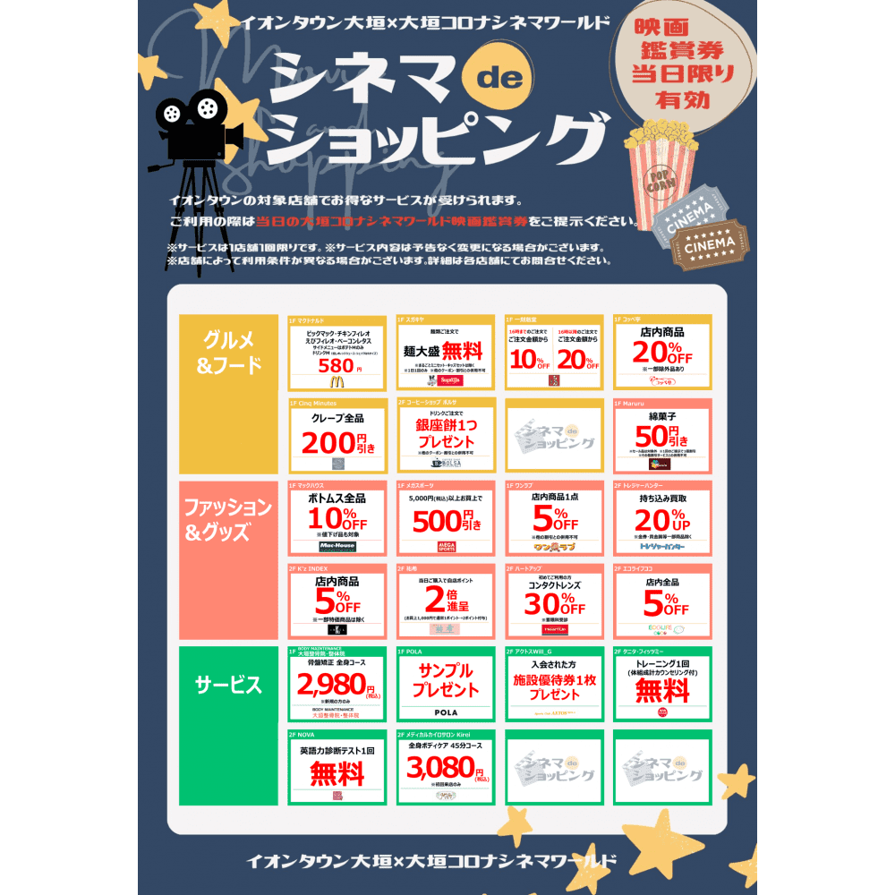 映画鑑賞券(※当日券のみ対応)を提示することで、1店舗につき1回、うれしい特典を受けることができます。映画を楽しんだあとは、そのままイオンタウン大垣でゆったりとお買い物を満喫するのもおすすめです。