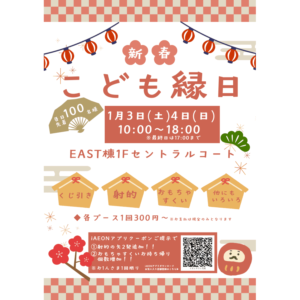 小さなお子さんと楽しめるイベントもありますよ!2026年1月3日(土)4日(日)には「新春 こども縁日」を開催。EAST棟1階セントラルコートにて、くじ引き・射的・おもちゃすくいなどを楽しむことができます。時間は、午前11時から午後5時まで。お支払いは現金のみとなっています。さらにiAEONアプリクーポンご提示で射的の矢2発追加等お得な特典も!